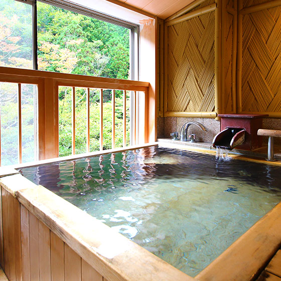 鹿教湯のお湯は、温泉療養をするのに最適な40度前後です。周りの景色を眺めながらのんびりと汗を流すもよし、繰り返し入浴して温泉療法を試みるもよし。身体の芯からあたたまる温泉で、疲れもストレスも溶けていくような心地よさを味わってください。ホテル入り口には、いつでもお飲みいただける飲泉もございます。