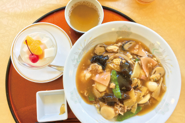 「ビュッフェダイニング渓泉」は、ランチタイムも営業。人気の「あんかけ焼きそば」は長野県のソウルフードの1つ! 野菜などの具材を入れた熱々のあんを麺にかけた中華料理は寒い冬こそおすすめです。からし酢をかけて味変をしながらお楽しみください。