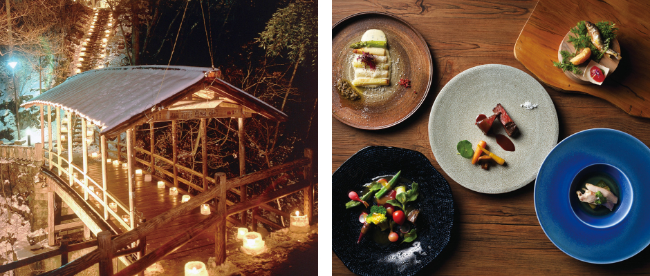 五台橋から文殊堂、薬師堂周辺に200個ほどの氷灯ろうで彩る鹿教湯の冬の風物詩ともいえるイベント。Restaurant 溪を利用すれば、食事をしながら氷灯ろうの景色を望むことができます。この期間にぜひご利用ください。