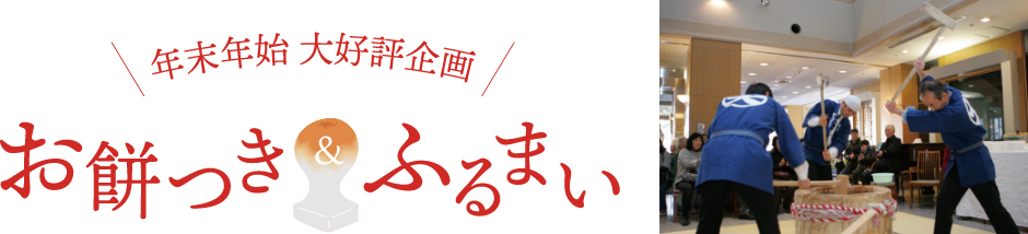 年末年始に斎藤ホテルにご宿泊してくださる皆さまに感謝の気持ちを込めて開催している、スタッフによるお餅つき。昔ながらの杵と臼を用意して、スタッフがテンポ良くついていきます。その掛け合いも見どころです。
