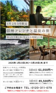『ジパング倶楽部1・2月号』ご覧の皆さまへ 2025/12/23 新着情報 ジパング俱楽部2026年1・2月号をご覧いただきまして 誠にありがとうございます。 1月・2月「信州フレンチプチ湯治プラン」の詳しい内容につきましては こちらからのページからご覧いただけます。 https://www.saito-hotel.co.jp/zipangu/202512/ 皆さまからのご予約を心よりお待ちしております。 « 【重要】2026年6月より長野県における宿泊税が導入されます New 『ジパング倶楽部1・2月号』ご覧の皆さまへ 【重要】2026年6月より長野県における宿泊税が導入されます 『ジパング倶楽部11・12月号』ご覧の皆さまへ リラクゼーションサロン「ディア・ハルム」より重要なお知らせ 【新レストラン連載コラム⑭】レストランに横浜港の地図がある深い理由 Category 新着情報 (34) 館内で過ごす (3) 日帰りバスツアー (2) アクティビティ (1) 斎藤コラム (21) Restaurant溪 (15) Archive 2025年12月 (2) 2025年10月 (1) 2025年2月 (1) 2025年1月 (2) 2024年10月 (1) 2024年9月 (1) 2024年8月 (1) 2024年7月 (1) 2024年6月 (2) 2024年5月 (1) 2024年4月 (1) 2024年3月 (1) 2024年2月 (1) 2024年1月 (4) 2023年12月 (3) 2023年11月 (2) 2023年10月 (2) 2023年8月 (2) 2023年7月 (1) 2023年5月 (2) 2022年10月 (2) 2022年9月 (1) 2022年8月 (1) 2022年2月 (1)